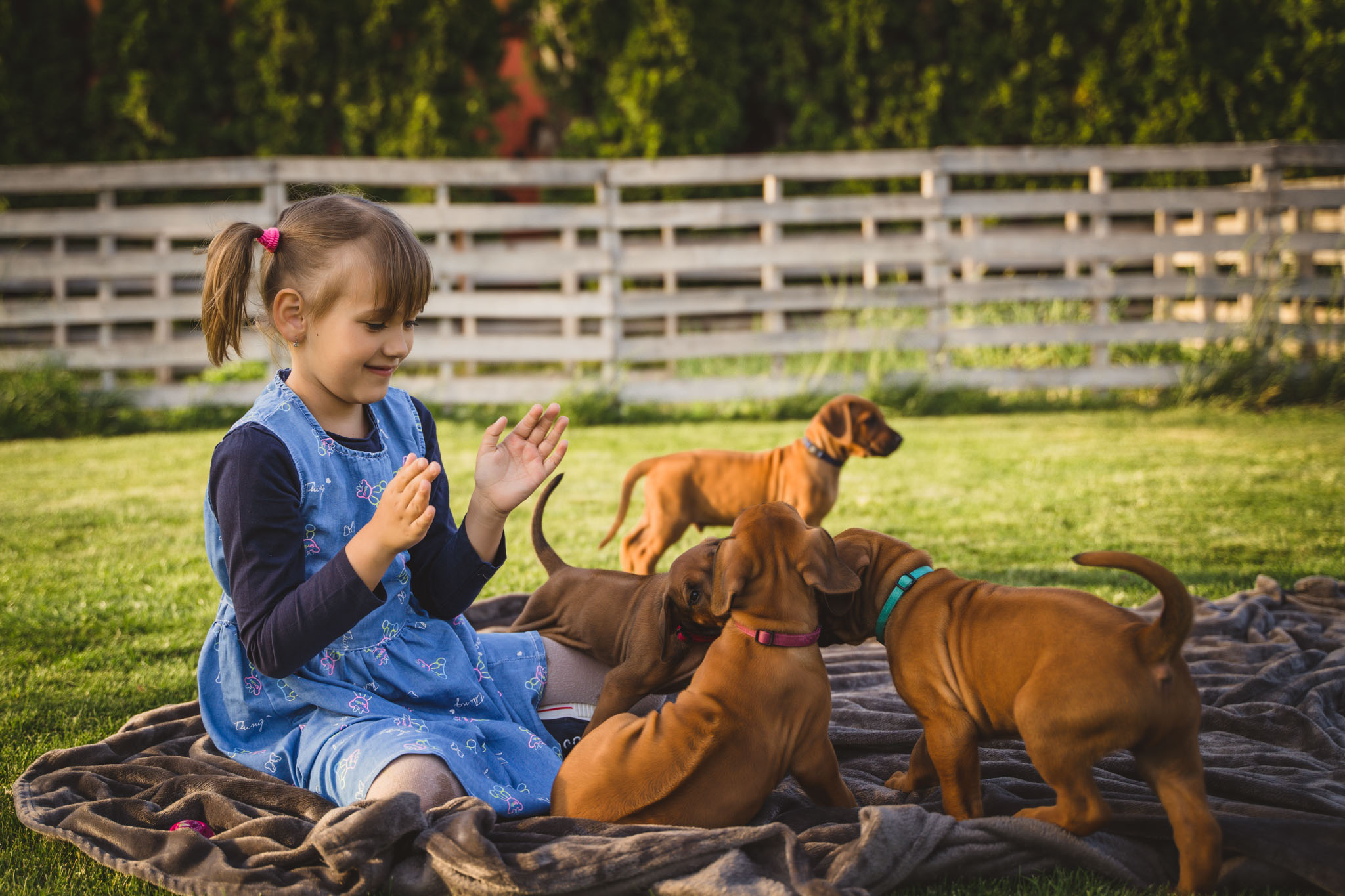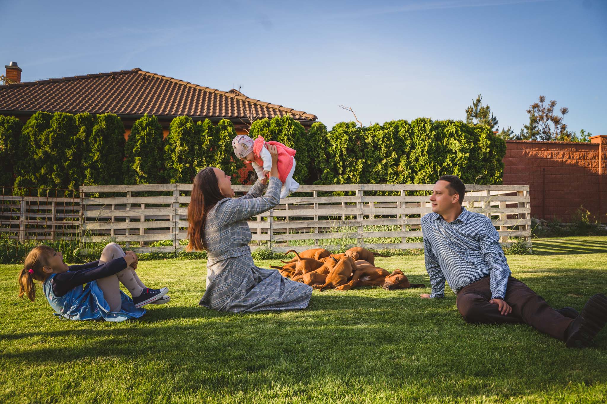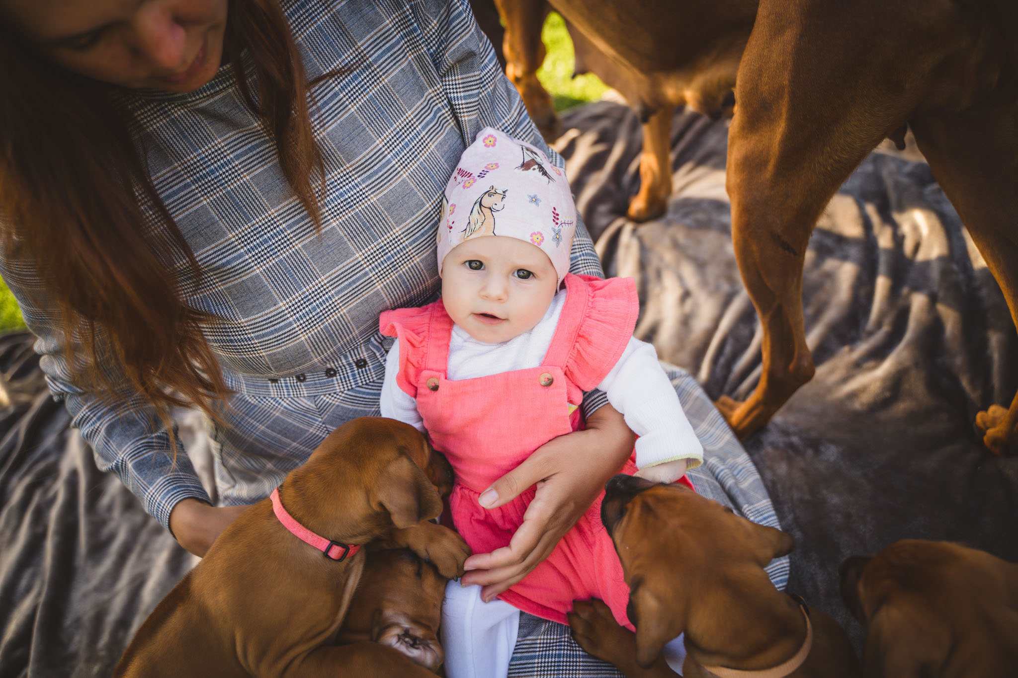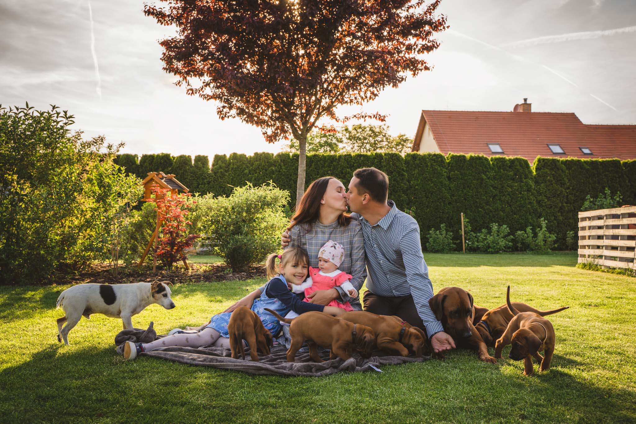 Rodinné focení focení v domácím, resp. zahradním prostředí, se – a to se podržte – 12 pejsky! Ale zvládli jsme ho bez větších problémů, jen jsem málem přišla o tkaničky u bot a neustále jsem měla kolem sebe aspoň jedno štěňátko 🙂
