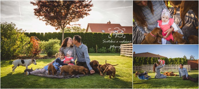 Rodinné focení focení v domácím, resp. zahradním prostředí, se - a to se podržte - 12 pejsky! Ale zvládli jsme ho bez větších problémů, jen jsem málem přišla o tkaničky u bot a neustále jsem měla kolem sebe aspoň jedno štěňátko 🙂